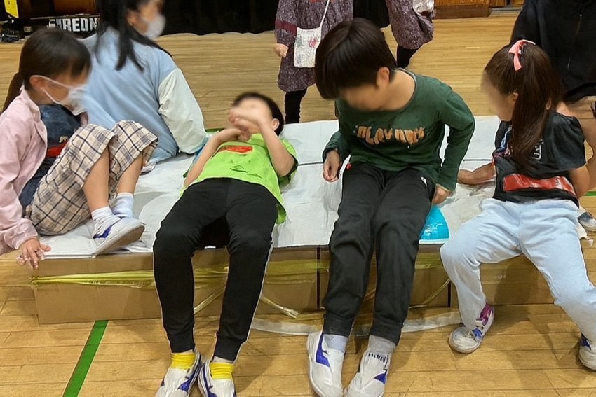 クエストの内容は、防災クイズ、救護担架リレー、段ボールベッドの組み立て競争、火災の煙(訓練用)からの脱出、防災倉庫に保管されている防災備品の名前を使ったビンゴゲームなどなど、どれも地域協働学校の皆さんが工夫を凝らしたものばかり。得点が発表されるたびに子どもたちの歓声が響き、会場は大いに盛り上がりました。今年の勝者は「みかんギルド」でした!